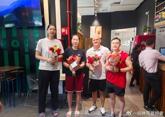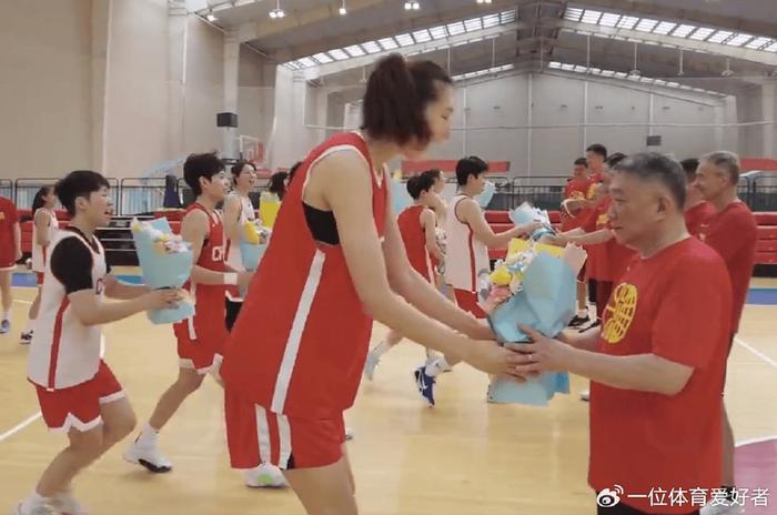 在训练课结束后,中国女篮的工作人员安排了球员每人手拿一束鲜花,送给教练组,包括主教练、几位助理教练、外教、体能师、视频分析师等等。因为9月10日是教师节,球员为辛勤付出的教练们送上鲜花表示祝福。