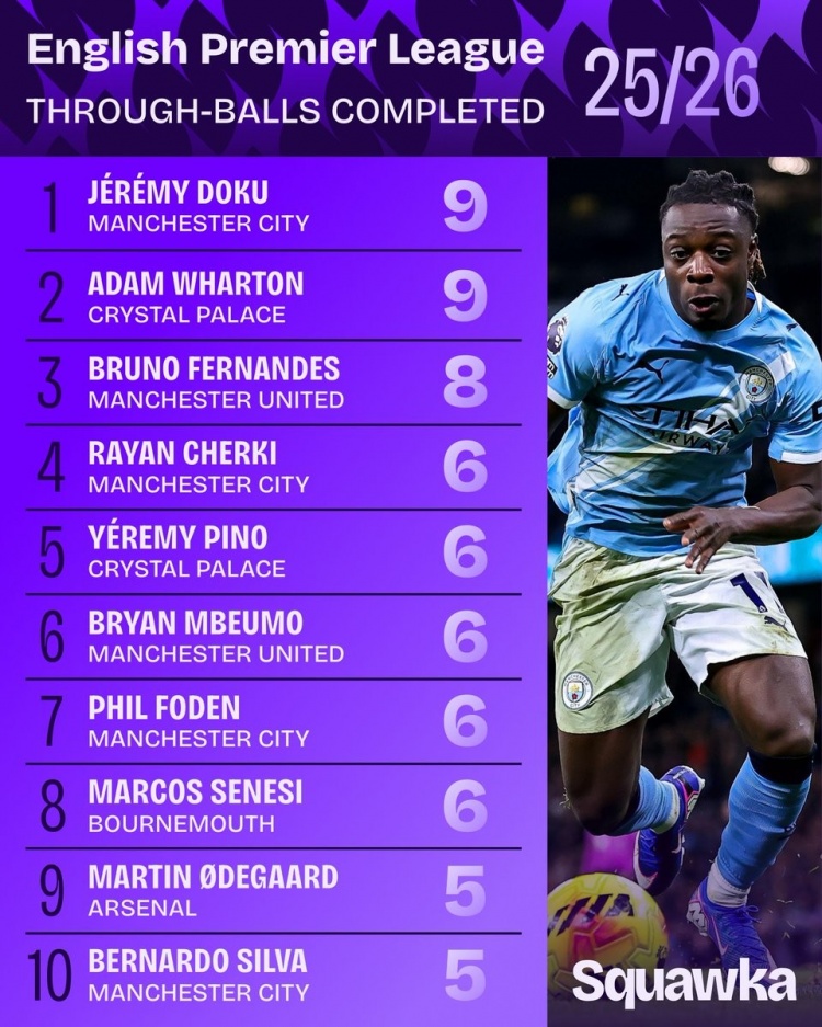 英超成功直塞榜:多库、沃顿并列居首,B费、福登、厄德高在列